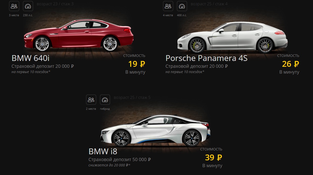 Средняя цена за минуту 15-20 рублей. Первые 10 поездок потребуют депозитной заморозки средств с карты в размере 5-20 тыс. рублей в зависимости от марки. На BMW i8 депозит сохранится в размере 20 тыс. рублей независимо от числа поездок.