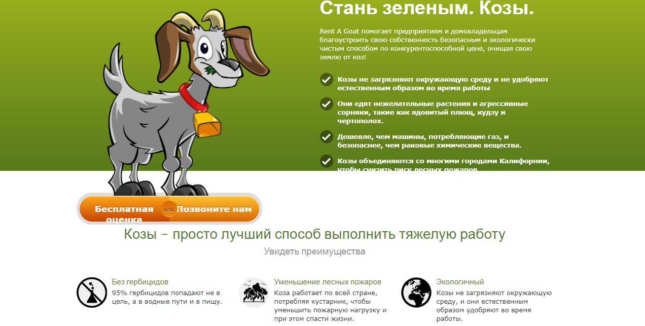 Американский проект Rent a Goat предлагает взять в аренду козу, которая расправится с сорняками на лужайке. Животное сможет разделаться с дикими травами, кустарником и чертополохом без химикатов и тяжёлой техники.