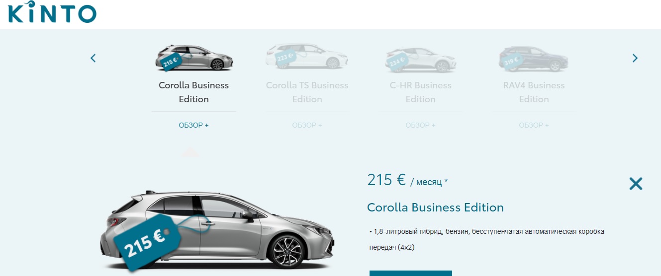 В линейке моделей по подписке представлены Toyota в модификации Business Edition: Yaris (от 155 евро в месяц), Corolla ( от 215 евро), С-HR (от 234 евро), RAV 4 (от 319 евро).